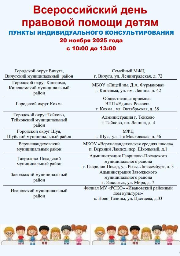 Более подробную информацию о проведении Всероссийского дня правовой помощи детям можно уточнить в Управлении Минюста России по Ивановской области по телефону 8 (4932) 26-79-68 (доб. 211, 298), на сайте to37.minjust.gov.ru в разделе «Всероссийский день правовой помощи детям 2025 год».
