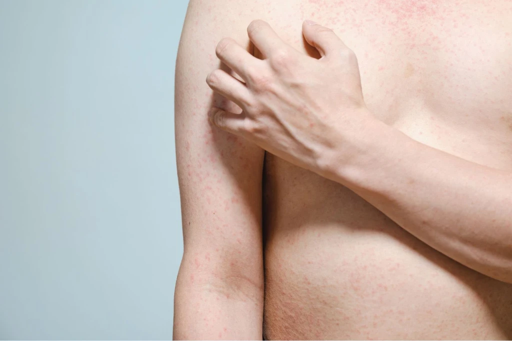 • Пятнисто-папулезная сыпь бледно-розового цвета.